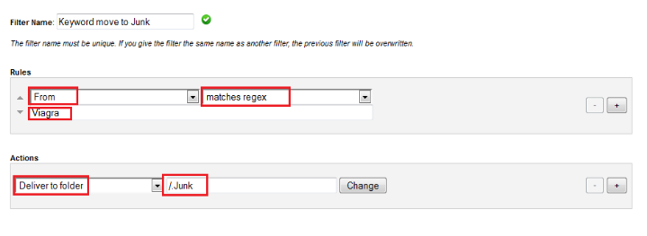 5) In the Rules option, select From as matches regex and type in the keyword in the text box eg. Viagra and lastly in the Actions option, select on Deliver to folder and click on Browse and choose on the folder you require eg. Junk