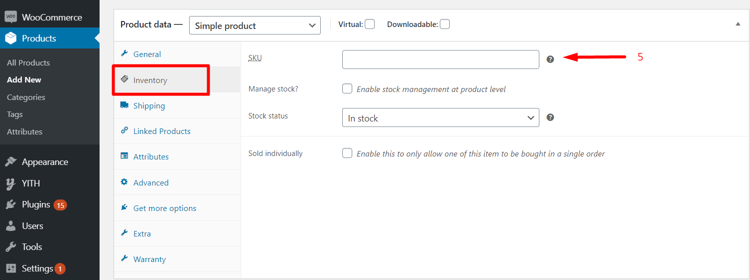 - The inventory section allows you to manage stock for the product individually and define whether to allow back orders and more. It enables you to sell products and allow customers to add them to the cart to buy.