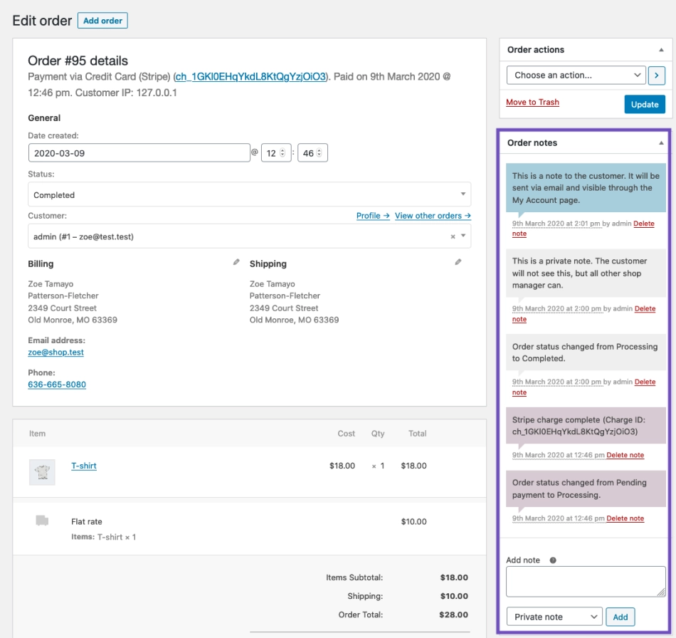 - Blue: Notes to the customer. Customers receive notes via email but can view them by viewing an order, or using the WooCommerce order tracking page.