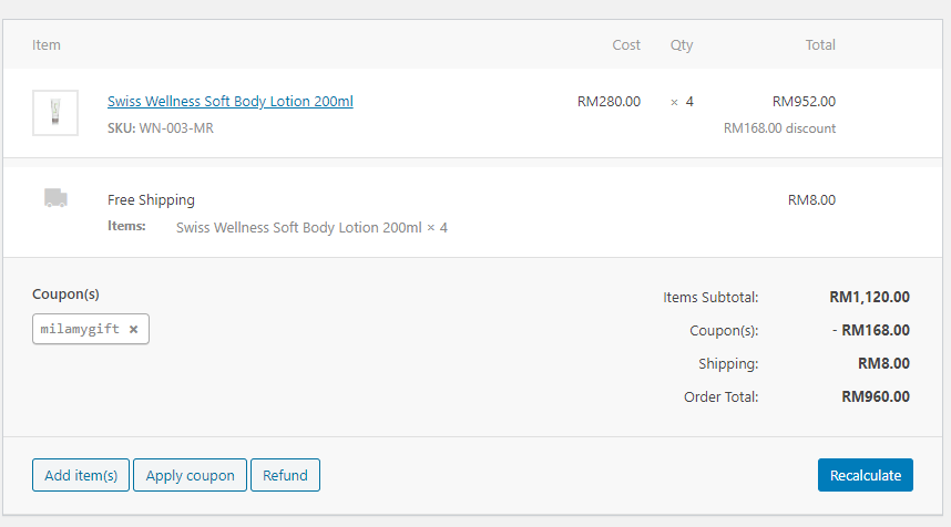 - Once you’ve done this, select Recalculate to make sure all the changes are reflected in the order totals.