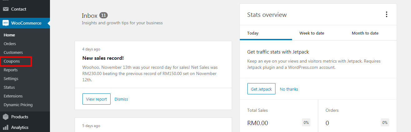 - Percentage discount : A percentage discount for the entire cart. For example, if the cart contains 3 t-shirts @ RM20 each = RM60, a coupon for 10% off applies a discount of RM6.