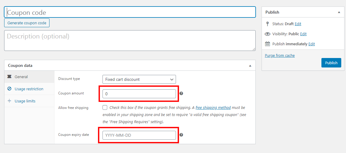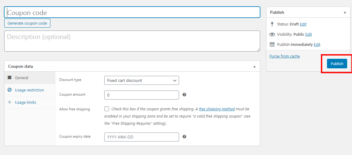 - Usage limit per coupon : How many times a coupon can be used by all customers before being invalid.