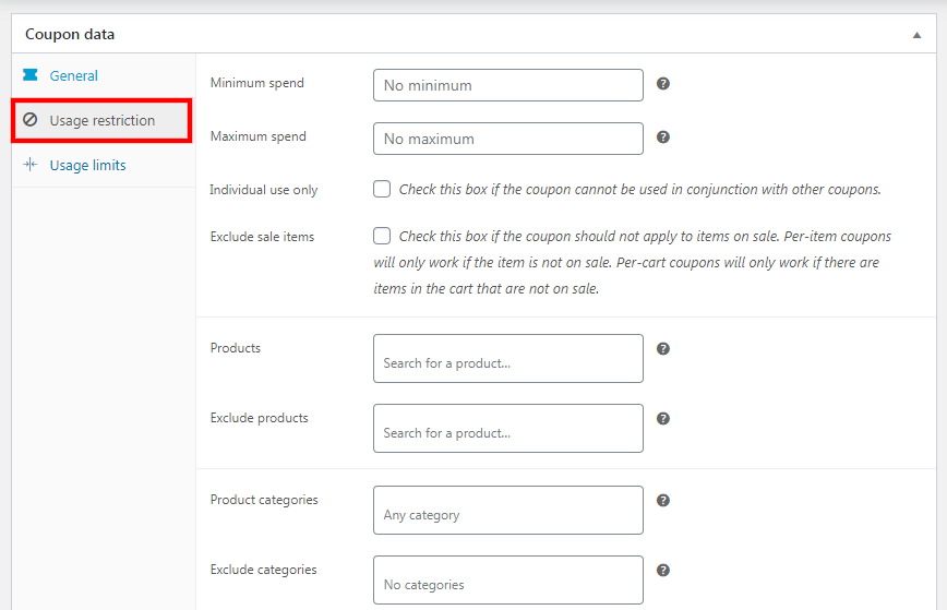 - Products : Products that the coupon will be applied to, or that need to be in the cart in order for the fixed or percentage discount to be applied.