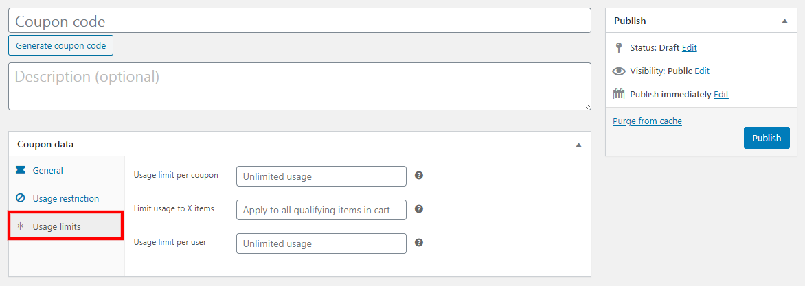 - Limit usage to X items : How many items the coupon can be applied to before being invalid. This field is only displayed if there are one or more products that the coupon can be used with, and is configured under the Usage Restrictions.