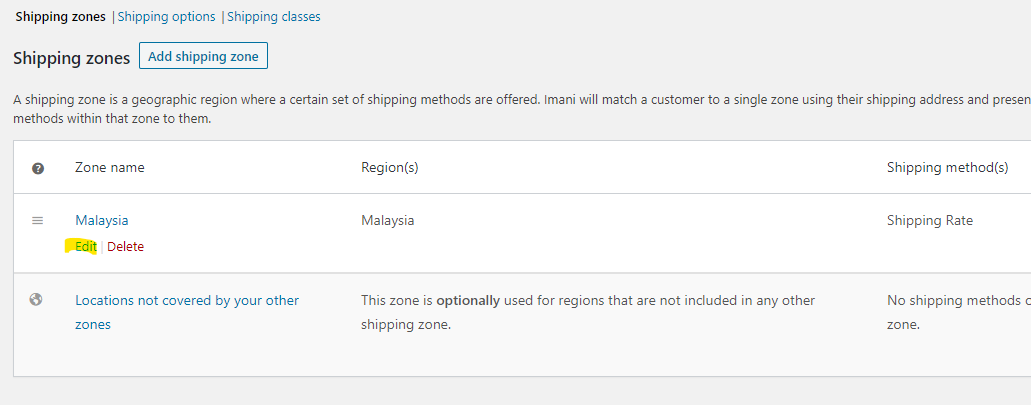 2/ Select edit below the name of the Shipping Zone you wish to add rates for.