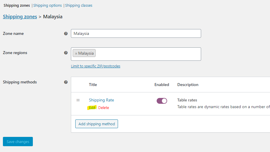 1/ If you can’t see the word “Table Rate” yet, Select Edit below the shipping zone that contains the Table Rate that you want to edit. This takes you to a different screen.