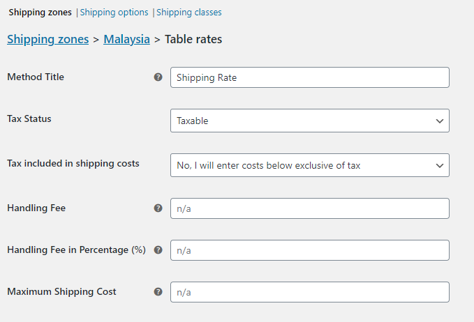 After the shipping method has been added to the shipping zone, settings for Table Rate need to be applied.