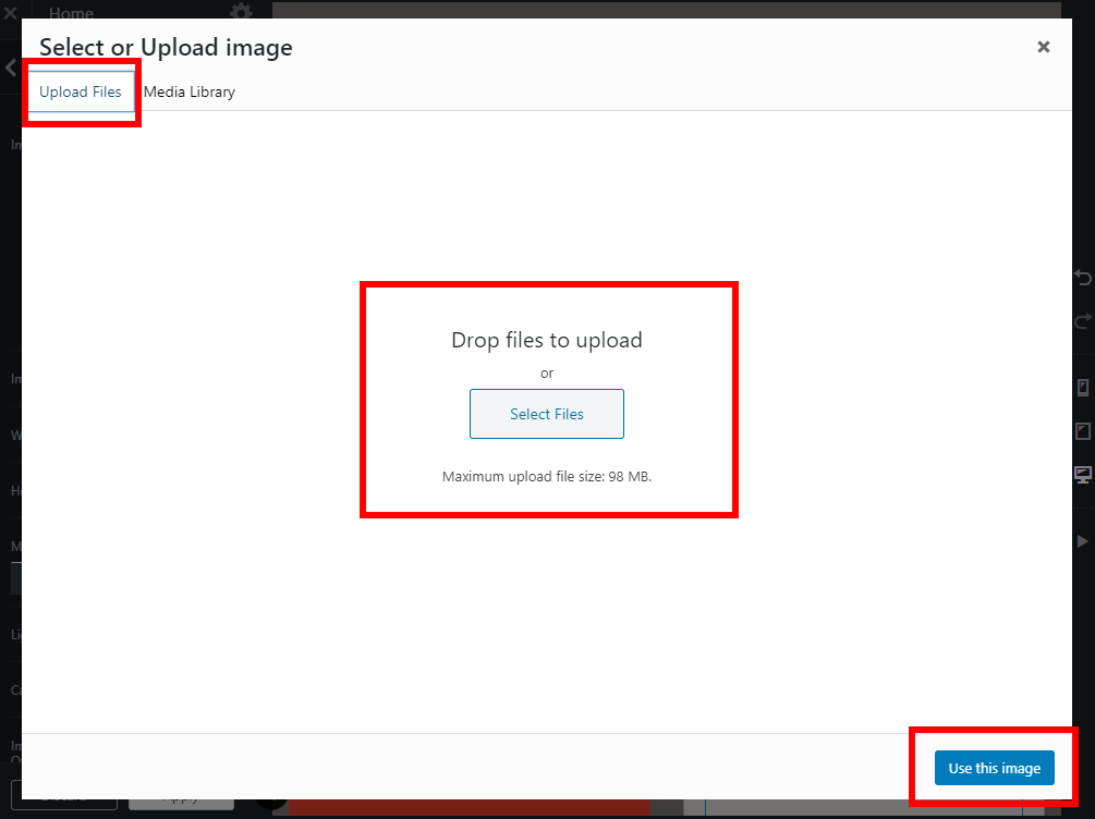 Click "Upload Files" at the top left corner first, then click "Select Files" and choose one of the images from your device to upload, then click "Use this image".
