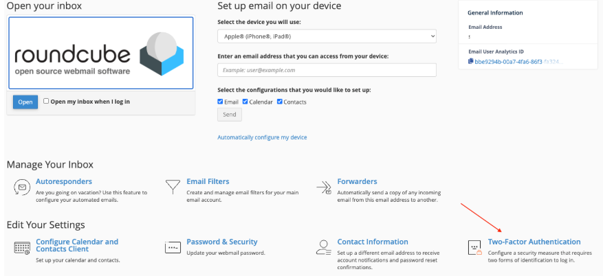 From the Webmail management screen, access Two Factor Authentication (Bottom right corner at the image below)