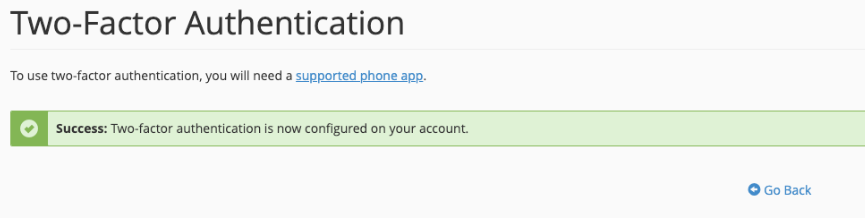 You will be greeted with the below message upon successful setup of the 2FA
